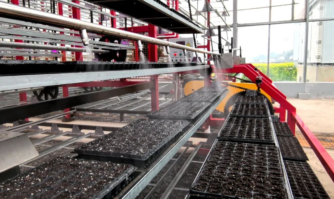 与传统大棚育秧不同的是,这里秧苗都生长在数米高的循环式智能育秧机床上,只需轻轻触动控制系统,机床轴轮便会带动一排排育苗盘整体呈“S”形,匀速上下移动,像是坐上了“过山车”,均匀地接受光照和水雾。整个育秧期间,大棚内的控温控湿系统可根据秧苗的生长情况,精准地控制水分、光照、温度和湿度,25—30天就可出苗,还可多批次循环育苗,不但节约了人工育秧产生的薄膜、苗盘、秧田翻耕等成本,而且大幅度提高了秧苗总体质量,确保春耕生产不误农时。